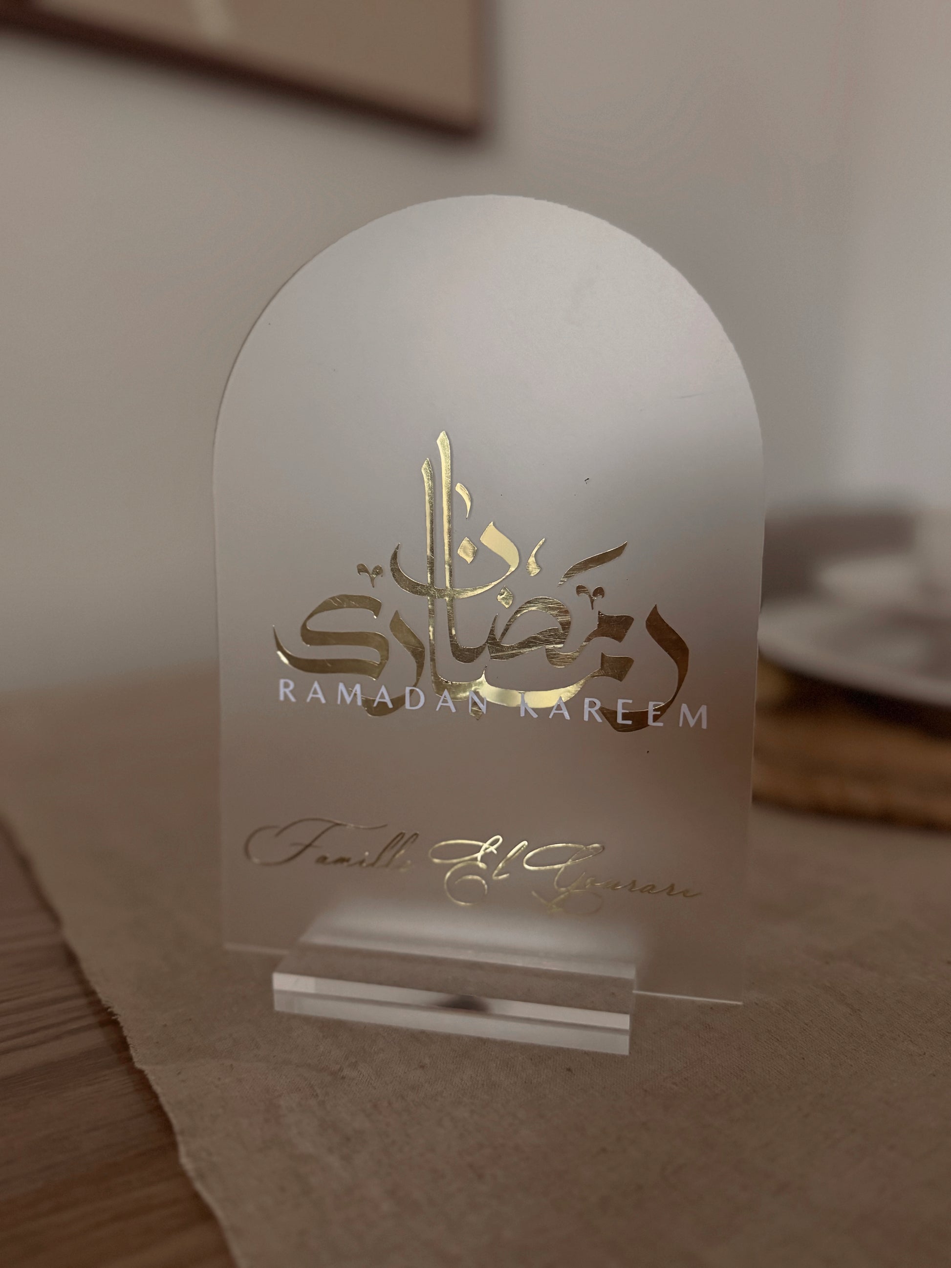 Apportez une touche d’élégance à votre décoration de Ramadan avec cette arche givrée personnalisée au format 12,5 x 17,5 cm. Idéale pour sublimer votre intérieur ou offrir un cadeau unique, elle est personnalisable avec l’inscription « Ramadan Kareem – Famille… ».